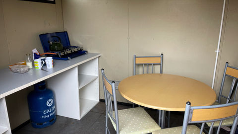 Our first job was be to set up a rudimentary kitchen. We now have a kettle and somewhere to sit!